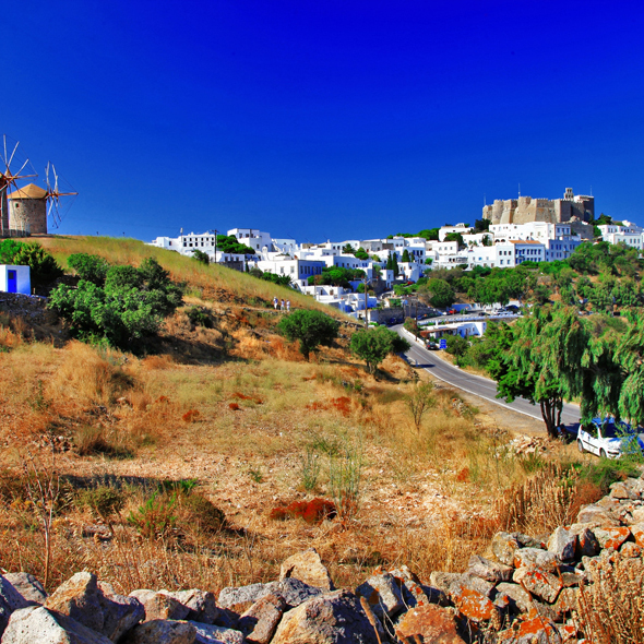 The Holy Isle of Patmos, one of the smaller Dodecanese Islands, occupies a narrow strip of land with numerous rocky hills and scant vegetation. The interior is sparsely populated with mostly shepherds and fishermen. In contrast, the waterfront areas see plenty of tourists during the summer months. There are only two main villages, Chora and Scala; whitewashed houses face Scala harbor or are scattered over the hillsides. The island's mild, healthy climate, year-round sunshine, delightful coves and numerous chapels combine to form a picture of unique beauty.